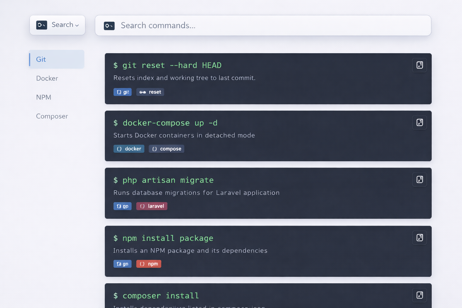 Terminal, Git, Docker, NPM... Toutes tes commandes dans un seul endroit. Avec description et cas d'usage pour les retrouver instantanément.