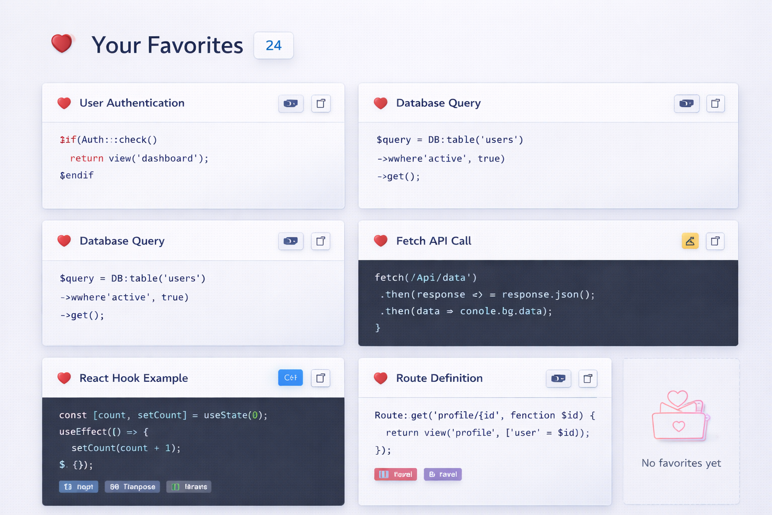 Marque tes snippets les plus utilisés en favoris pour y accéder en un clic. Gain de temps garanti.